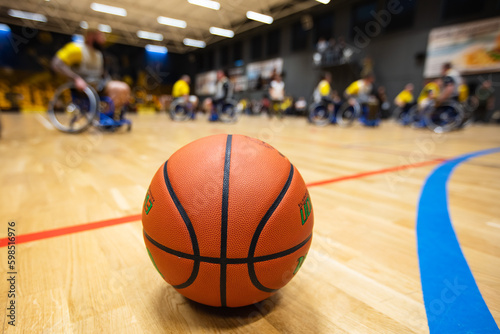 Obraz premium Closeup of basketball ball on the court during wheelchair