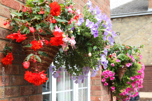 © jacquimartin, Naklejka premium Closeup of beautiful begonia flowers in hanging baskets