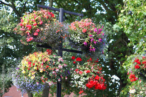 © jacquimartin, Fototapeta premium Closeup of beautiful begonia flowers in hanging baskets
