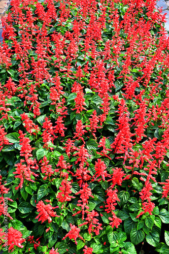 © masterjew, Naklejka premium Closeup of Beautiful Red Salvia Flowers with flowers bunched on the trunk like cannons in the garden, Thailand.