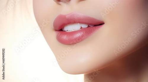 Fototapeta premium Closeup of beautiful smile of young woman with healthy white teeth. Healthcare concept. Generative AI