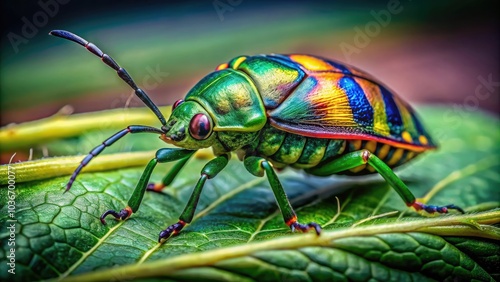 Naklejka premium Closeup of Beautiful Wildlife Bug on Green Leaf - Macro Nature Photography, Insects in Habitat, Vibrant Colors, Detailed Features, Close-Up Shots of Nature, Biodiversity, Environmental Beauty