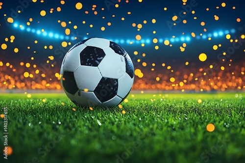 © Snigdha, Fototapeta premium CloseUp of Black and White Soccer Ball on Green Grass at Night Stadium Lights Bokeh