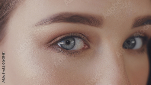 Fototapeta premium closeup of blue eyes of young woman looking at camera, Studio light ideal...