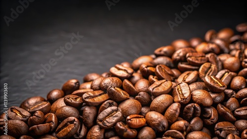 Naklejka premium Closeup of brown roasted coffee beans on a dark background, coffee, beans, roasted, closeup, dark, background, caffeine, beverage