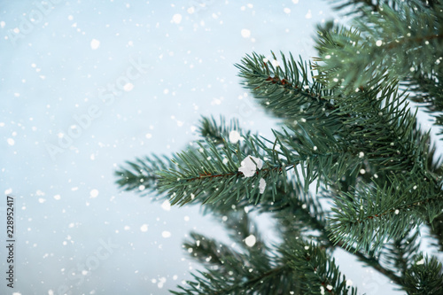 Fototapeta premium Closeup of Christmas tree with snow flake. Christmas and New Year holiday...