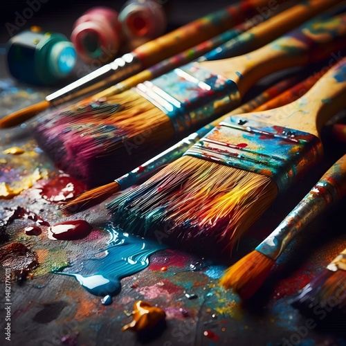 © R.Fauzi, Obraz premium Closeup of Colorful Paintbrushes with Paint on a Dark Surface