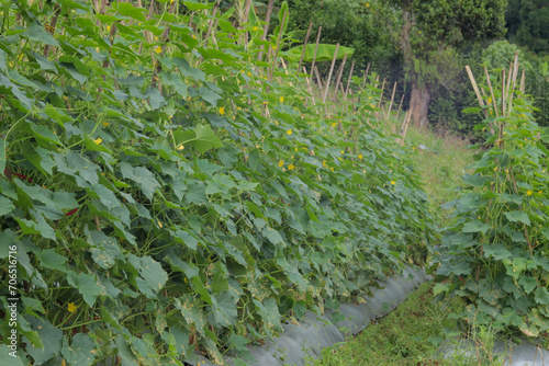 © upen, Obraz premium closeup of cucumber planting method using climbing poles