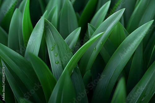 © Santri, Obraz premium Closeup of Dew Covered Green Grass Blades in Sunlight