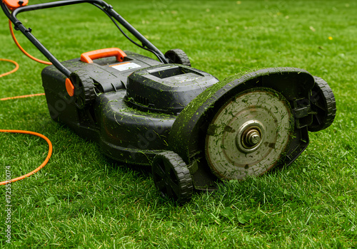 Fototapeta premium Closeup of electric lawn mower on green grass, ready for yard maintenance task
