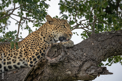 © Terri, Obraz premium Closeup of female leopard lying in tree in afternoon light