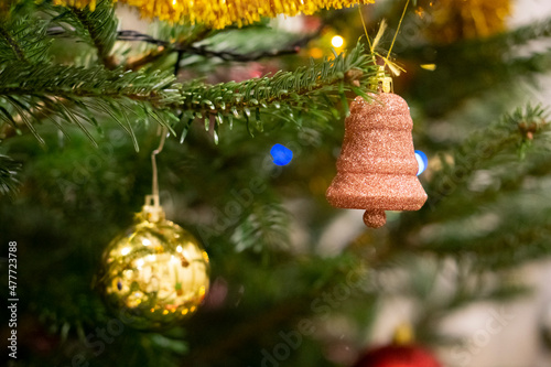Fototapeta premium Closeup of Festively Decorated Christmas tree with beautiful toys on blurred...