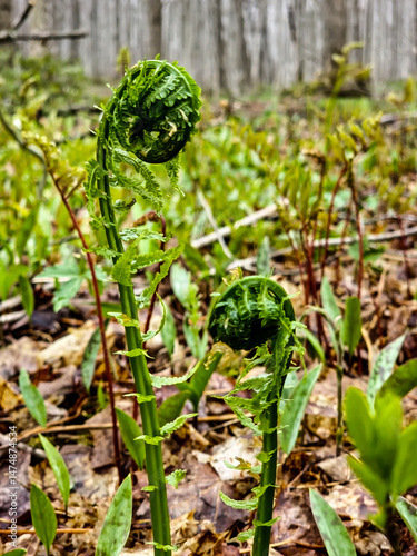Fototapeta premium Closeup of fiddleheads growing in the forest with a soft focus forest...