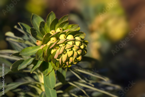 Fototapeta premium Closeup of flowers of Euphorbia characias subsp. wulfenii in a garden in...