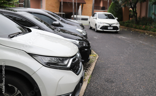 © Amphon, Fototapeta premium Closeup of front side of white car and other cars parking in parking area in rainy day.