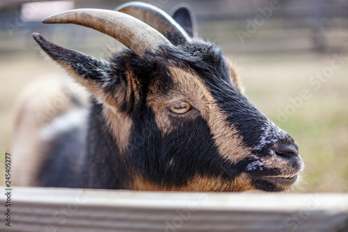 © Noel, Fototapeta premium Closeup of goat head seen through fence.