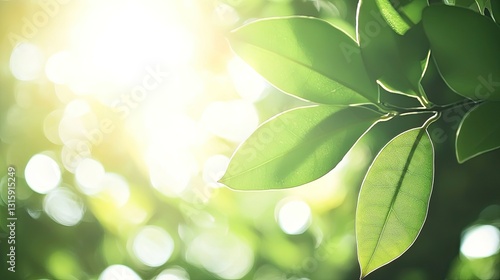 © R&R Studio, Naklejka premium Closeup of Green Leaves Glimmering in Natural Light with Soft Sunlight and Bokeh Effects Creating a Tranquil Atmosphere in a Lush Environment