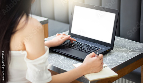 © Lek, Fototapeta premium Closeup of hand businesswoman typing on keyboard and writing information on notebook