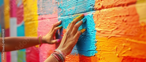 © Starkreal, Fototapeta premium Closeup of hands creating graffiti art on a wall