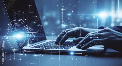 © MOHON, Naklejka premium Closeup of hands typing on a laptop with digital network overlay
