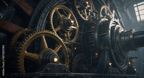 Fototapeta premium Closeup of intricate steampunk gears and machinery in a workshop
