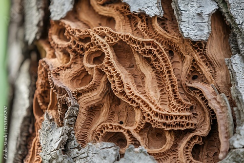 Fototapeta premium Closeup of intricately carved tunnels in tree bark, likely created by...
