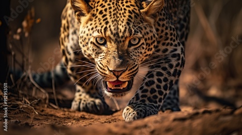 © stocksbyrs, Fototapeta premium Closeup of leopard stalking prey