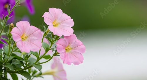 © shammiCRATION, Fototapeta premium Closeup of light pink petunia flowers with a soft green background outdoors