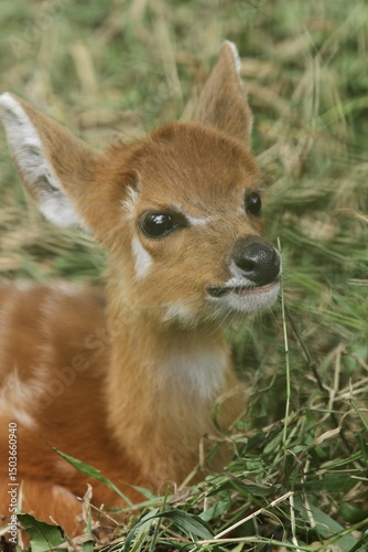 © Pitokung, Fototapeta premium closeup of little sitatunga relaxing on the grass