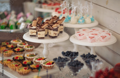 Naklejka premium Closeup of many small cakes, sweets, fruits served on plate for cocktail party. Candy bar on birthday or wedding holiday dinner. catering food. tasty dessert. Wedding banquet table. Fruit bar on party