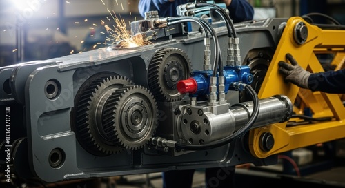 © DigitalSpace, Fototapeta premium Closeup of mechanical gears and hydraulic parts being fitted into a tower crane arm inside an industrial fabrication shop.