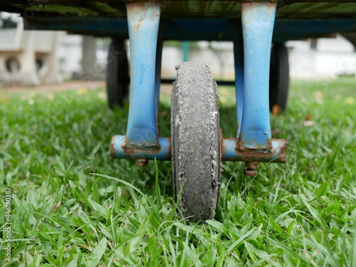 © Chanonnat, Fototapeta premium closeup of old black cart wheels in the garden.