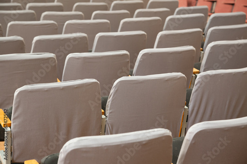© liubomirt, Naklejka premium Closeup of old grey seats in cinema
