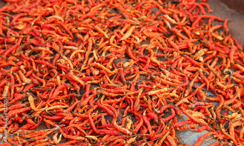 Fototapeta premium Closeup of organic red ripe chili drying under sunlight.