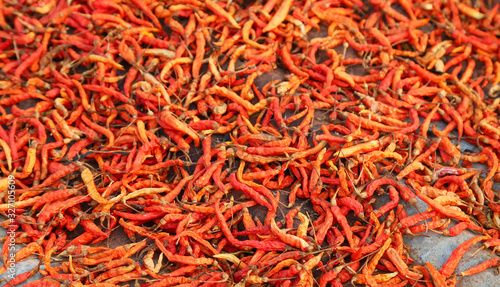 Fototapeta premium Closeup of organic red ripe chili drying under sunlight.