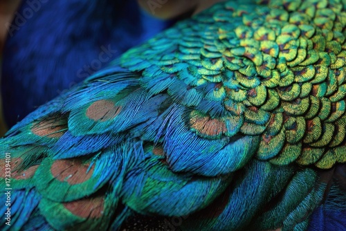 © Sulaihatin, Obraz premium Closeup of peacock feathers displaying vibrant blue green and yellow iridescent colors and intricate patterns