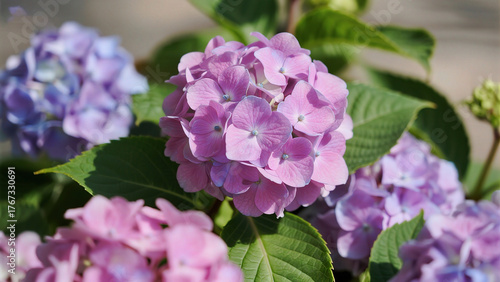 Fototapeta premium Closeup of pink and purple hydrangea flowers