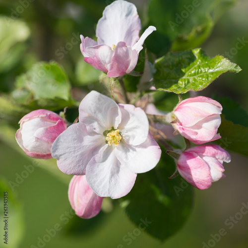 Obraz premium closeup of pink spring apple blossoms with green background