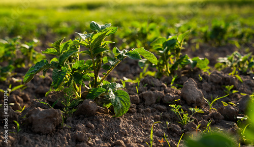 Fototapeta premium Closeup of potato plants growing in agricultural field at sunset