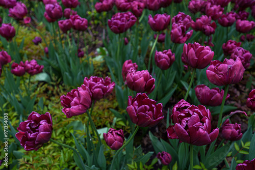 © Wirestock, Fototapeta premium Closeup of purple beautiful tulips in a park