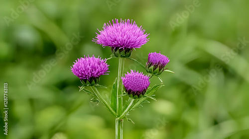 © Robin, Fototapeta premium Closeup of Purple Thistle Flowers in a Green Field