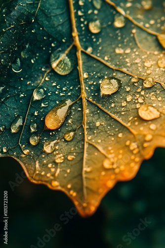 © atar, Fototapeta premium Closeup of Raindrops on Green and Yellow Leaf