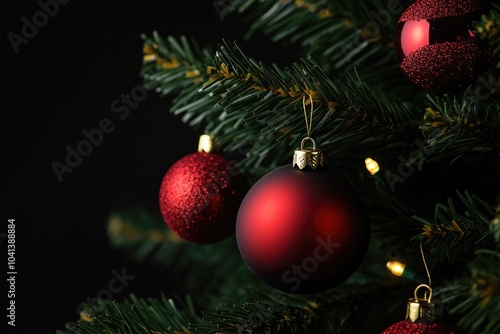 Fototapeta premium Closeup of Red Christmas Ornaments on a Green Tree Branch
