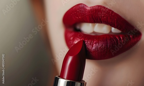 Obraz premium closeup of red lipstick with woman's lips for beauty and cosmetics concept ,...