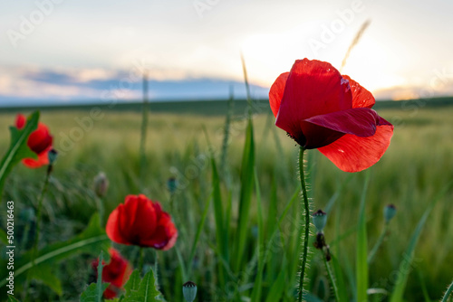 Naklejka premium Closeup of red poppy in rural field against summer sky in Bad Friedrichshall,...