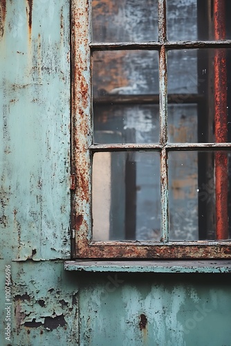 © atar, Naklejka premium Closeup of Rusty Window on Weathered Green Building