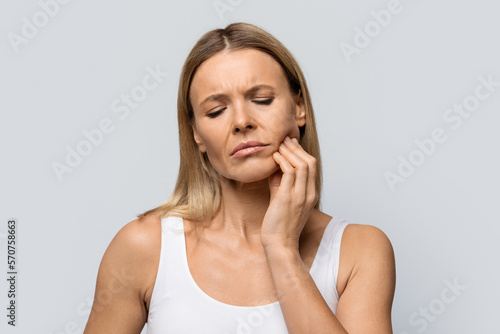 Fototapeta premium Closeup of sad lady experience strong toothache