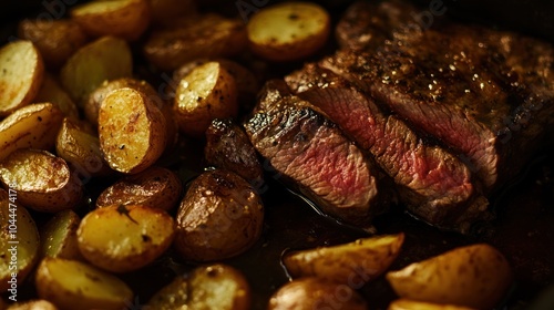Obraz premium Closeup of Seared Steak and Roasted Potatoes