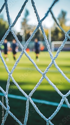 © MdArshed, Fototapeta premium Closeup of Soccer Net with Blurred Players Practicing on Green Field Background