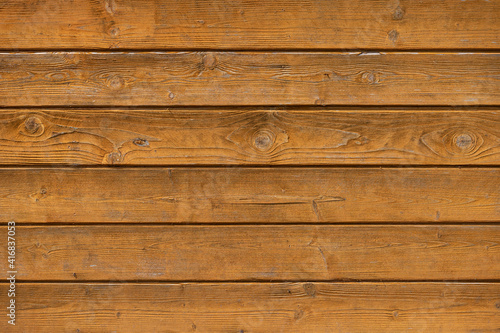 Naklejka premium Closeup of texture of weathered varnished wooden wall. Aged wooden plank fence. Copy space